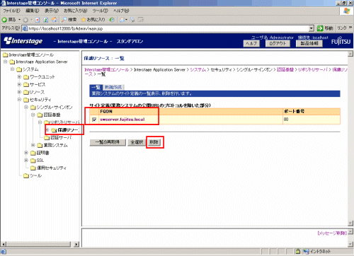 [Interstage 管理コンソール]で、[システム]-[セキュリティ]-[シングル・サインオン]-[認証基盤]-[リポジトリサーバ]-[保護リソース]を選択します。
