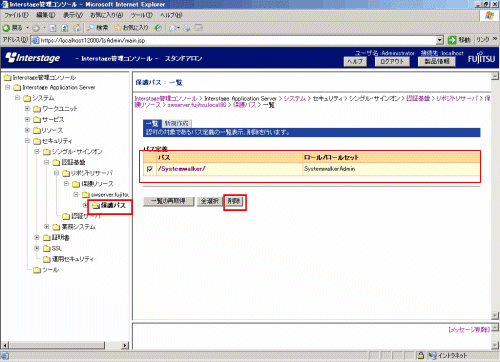 [Interstage 管理コンソール]で、[システム]-[セキュリティ]-[シングル・サインオン]-[認証基盤]-[リポジトリサーバ]-[保護リソース]-[FQDN:ポート番号]-[保護パス]を選択します。
