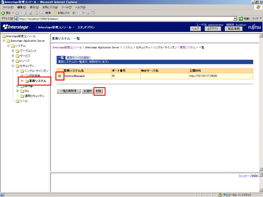以下の画面で[システム]-[セキュリティ]-[シングル・サインオン]-[業務システム]を選択し、削除する業務システムのチェックボックスを選択し、[削除]ボタンを選択します。