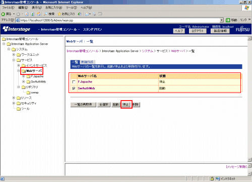 2. 以下の画面で、[システム]-[サービス]-[Webサーバ]を選択し、認証サーバ用に構築したWebサーバのチェックボックスを選択し、[停止]ボタンを選択します。