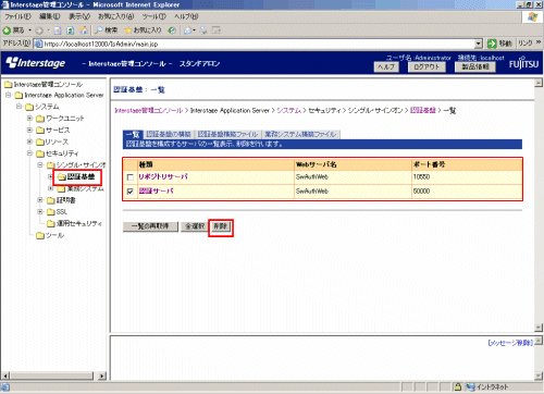 3. 以下の画面で、[システム]-[セキュリティ]-[シングル・サインオン]-[認証基盤]を選択し、[リポジトリサーバ]、[認証サーバ]のチェックボックスを選択し、[削除]ボタンを選択します。