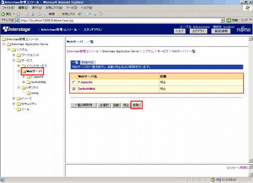 4. 以下の画面で、[システム]-[サービス]-[Webサーバ]を選択し、手順2で停止したWebサーバのチェックボックスを選択し、[削除]ボタンを選択します。