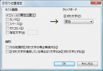 ホスト画面上のどの位置を区切り文字の対象にするかを指定します。フィールド属性位置、カンマ、スペース、セミコロン、および、指定文字の複数を指定できます。