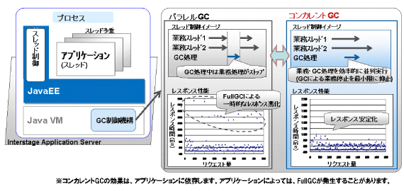 JavaVMにおいて、従来のパラレルGCに加え、アプリケーションスレッドと並行でGC(Garbage Collection)を実行するコンカレントGC(コンカレント・マーク・スイープGC付きパラレルGC)を提供します。この機能によって、GCによるアプリケーションスレッドの停止時間を最小限にしてレスポンスのバラツキを抑えることができます。