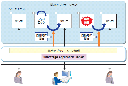 アプリケーション異常(異常終了、ループ、デッドロック)を早期に検知し、アプリケーションの再起動などにより自動的に業務を復旧できます。復旧中も業務リクエストを受け付けて、業務の停止や遅延を回避できます。アプリケーションの復旧処理は、IJServerクラスタ/ワークユニットのサービスレベルとして設定変更が可能です。