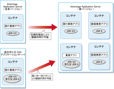 また、1つのアプリケーションサーバで複数の異なるJDKを実行できます。これにより、新たな業務は最新JDKで構築・運用し、従来の業務は旧JDKで運用できます。さらに、外部のパッケージソフト(適当なJDKで動作)を運用するなど、1つのアプリケーションサーバですべて業務を実行できます。