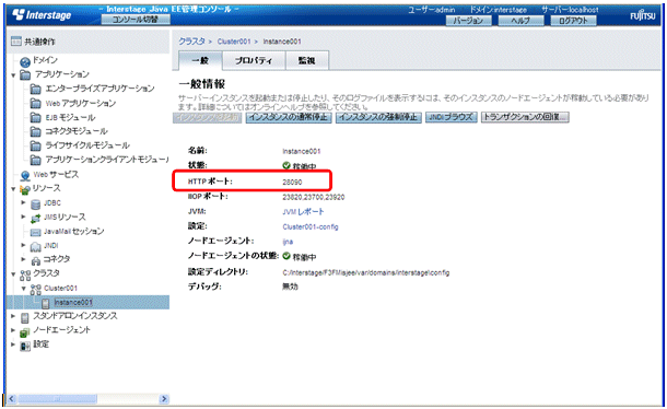 接続するサーバーインスタンスのHTTPポートを指定してください。Interstage Java EE管理コンソールのサーバーインスタンスの一般情報を参照することで、以下のように使用されているポート番号が表示されます。