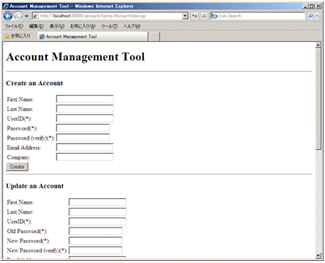 以下のように表示されます。このサンプルは、ユーザアカウントの登録・更新・削除・参照・リスト検索を行う簡単なサンプルとなっています。
