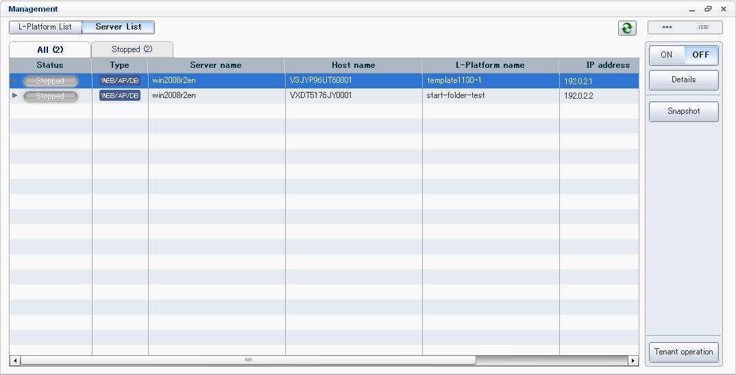 The buttons in the upper-left section of the page can be used to switch between the "L-Platform Management" and "Server List" display formats.