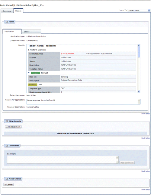 Select the task with the activity name "Cancel" on the process instance that you want to cancel, and then click the Details tab.