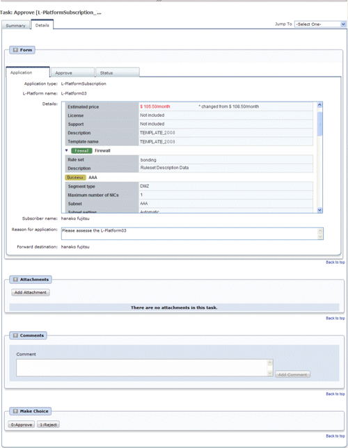 For L-Platform usage applications (when the L-Platform template has been reconfigured) and for L-Platform reconfiguration applications, information from prior to any modifications can also be displayed under Details.