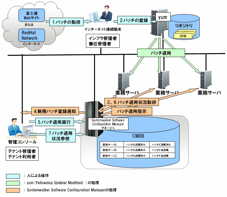 2 | パッチの登録 | ○ | ○ | - | - | パッチ(RPM)の登録方法については、yumのマニュアルを参照してください。 Linuxパッチ管理対象の定義方法については、「2.1.2 Linux OSパッチ管理対象の定義」を参照してください。 yumキャッシュクリーン通知コマンドについては、『リファレンスガイド』の「yumキャッシュクリーン通知コマンド」を参照してください。 |