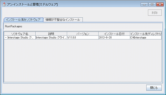[ソフトウェア名]から[Interstage Studio クライアント運用パッケージ]を選択して、[削除]をクリックすると、次の画面が表示されます。