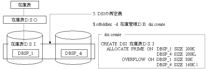以下に既存のDSIを削除し、新規データベーススペースを追加する形で再定義および再作成する例を示します。この例は、在庫表に対応する在庫表DSIにデータベーススペースDBSP_4を追加補充し容量を拡張する例です。なお、DBSP_4はローデバイス/dev_symfoware/raw13上に作成されるものとします。