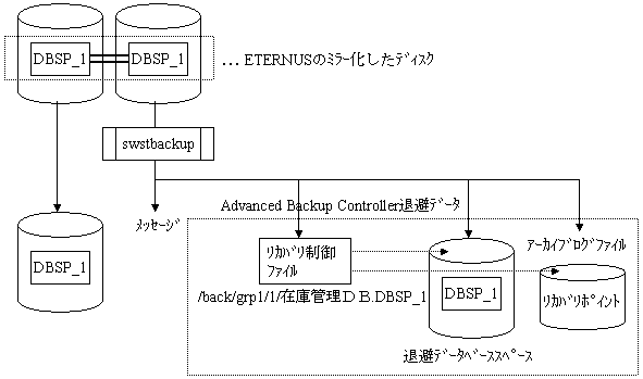 Advanced Backup Controllerの退避データは切り離されたETERNUSのバックアップボリュームである退避データベーススペースと、リカバリ時に必要な情報が格納されたリカバリ制御ファイルの2つが、データベーススペース単位に作成されます。