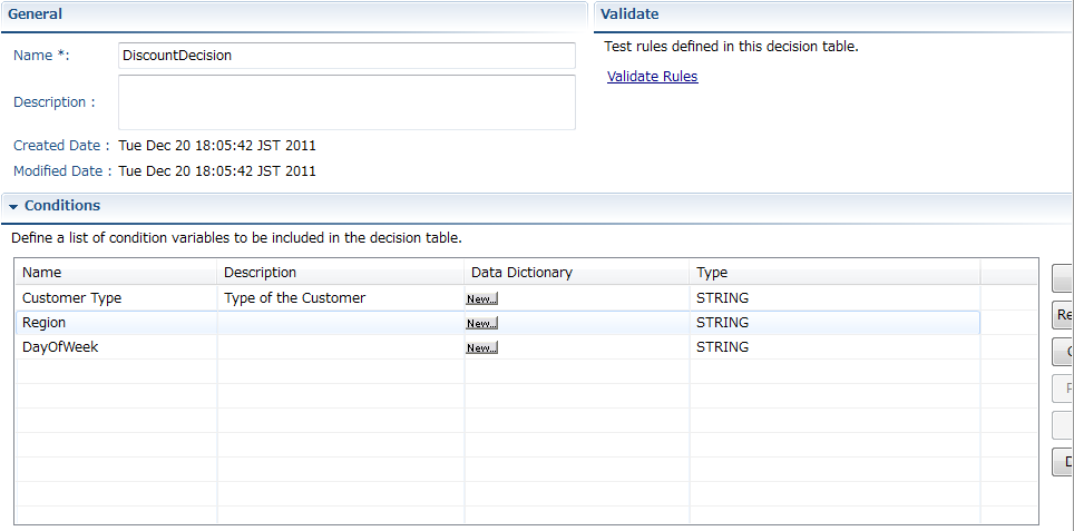 To add a new condition to the Decision Table, in the Condition section of the Decision Table Editor, click Add.