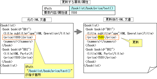 要素の更新例を以下に示します。この例では、XPath“/booklist/book/price/text()”で示される位置の値を、“1000”から“1500”に更新しています。なお、“text()”は、テキストノードであることを表しています。