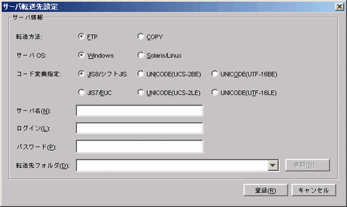 サーバOS | IN/OUT | △ | ― | 上記転送方法が“FTP”の場合にだけ、“Windows”もしくは“Solaris/Linux”のどちらかを選択します。転送先のOSが、Windowsの場合には“Windows”を、SolarisまたはLinuxの場合には“Solaris/Linux”を選択してください。 |