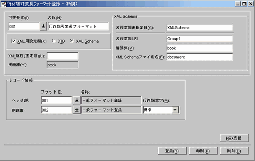 図4.39 XML用設定欄をON、XML Schemaを選択時の行終端可変長フォーマット登録画面(登録例)