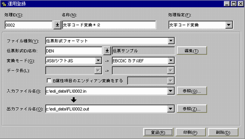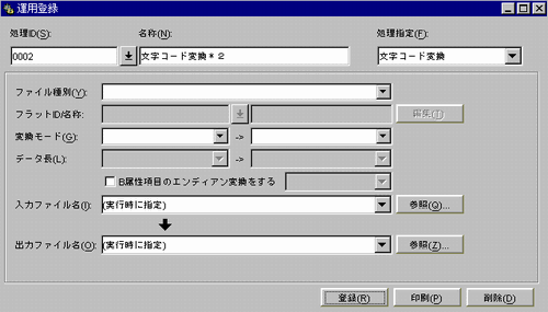 [運用登録]画面の[処理指定]において、[文字コード変換]を選択します。