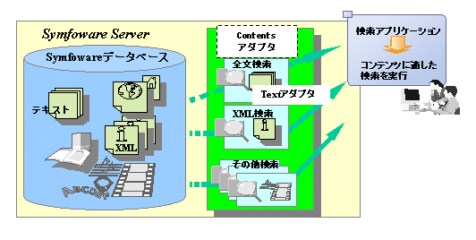 さらに、Symfoware Serverでは、蓄積された膨大な量のコンテンツに対して、そのコンテンツの特徴を活かした検索機構を提供するためのContentsアダプタという考え方を導入します。Contentsアダプタとは、データベースに蓄積されたコンテンツに対して、それぞれのコンテンツの特徴を活かした高速なデータ検索機構を搭載可能とするための考え方です。