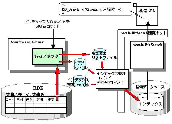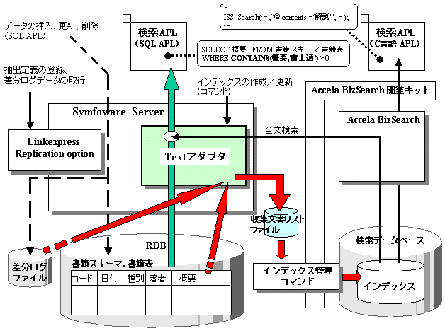 以下の図に、Textアダプタによるインデックス作成・更新時のSymfoware ServerとAccela BizSearchの関係を示します。