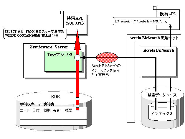 以下の図に、Textアダプタによる全文検索実施時のSymfoware ServerとAccela BizSearchの関係を示します。