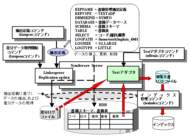 Textアダプタは、インデックス作成後に、データベースが更新された場合、差分データからインデックスを更新することができます。更新には、Linkexpress Replication optionが提供する差分データの蓄積機能を使用します。同様に、対象のデータベースから文書データを抽出する場合も、Linkexpress Replication optionのデータの抽出機能を使用します。
