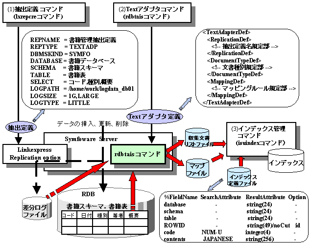また、出力した収集文書リストファイルとマップファイルは、Accela BizSearch開発キットが提供するインデックス管理コマンド(isuindexコマンド)の入力情報として使用します。Textアダプタ定義は、表またはDSIを単位として作成し、抽出定義と対応付けます。