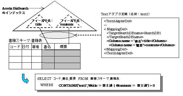 図の例では、「書籍」列と「概要」列を全文検索の対象とし、それぞれフィールド名「title」、「contents」としてAccela BizSearchのインデックスを作成しています。Textアダプタ定義は、これらの検索対象の列とAccela BizSearchのインデックスに各フィールドとの対応関係を規定しています。