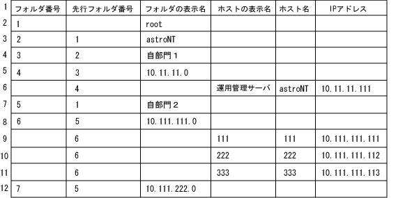 フォルダ番号,先行フォルダ番号,フォルダの表示名,ホストの表示名,ホスト名,IPアドレス