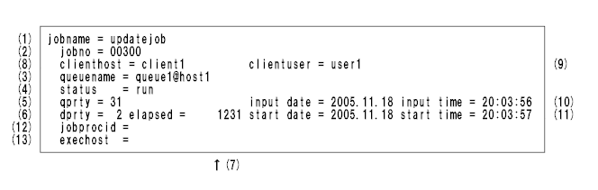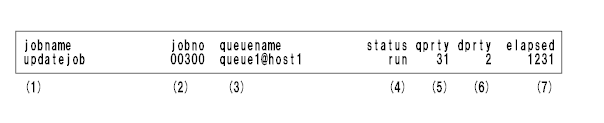 (1) ジョブ名(一般ユーザが実行した場合、ジョブ名の表示は20バイトまで) (2) ジョブ番号 (3) キュー名 (4) ジョブの状態 [run:実行中,que:実行待ち,hld:実行保留,oph:出力保留] (5) ジョブの実行優先順位 (6) ジョブの実行優先度 (7) ジョブの実行が開始されてからの経過時間(実行中ジョブのみ) (8) クライアントホスト名 (9) クライアントユーザ名 (10) ジョブの投入時刻 (11) ジョブの実行開始時刻(実行中ジョブのみ) (12) ジョブプロセス番号 (13) 依頼ホスト名