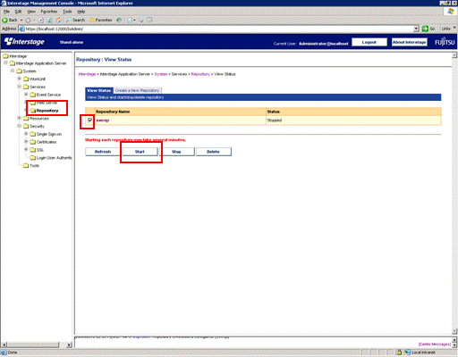In the Interstage Management Console window, select System >> Services >> Repository, select the check box for the Systemwalker authentication repository that has just been created, and then click the Start button.