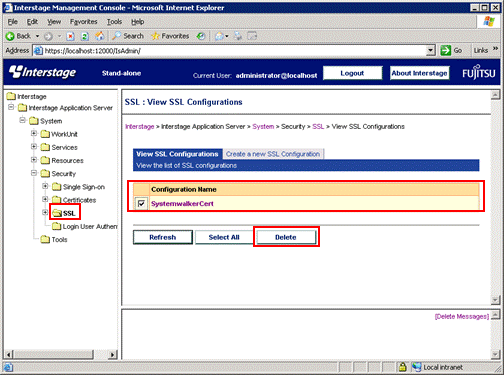In the Interstage Management Console window, select System >> Security >> SSL. Select the check box for the SSL environment that was created for the Systemwalker product, and then click the Delete button.