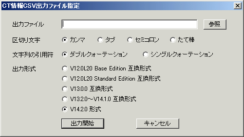 [出力形式] | 出力するCSVファイルの形式を選択します。 [V12.0L20 Base Edition 互換形式]:V12.0L20 Base Edition形式で出力します。 [V14.2.0 形式]:V14.2.0 形式で出力します。 出力されるCSVファイルの項目名と出力情報の説明については、“Systemwalker Desktop Keeper リファレンスマニュアル”の“CT情報”を参照してください。 |