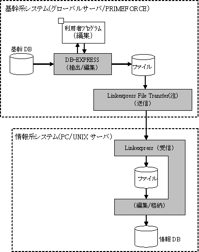 グローバルサーバ/PRIMEFORCEからPC/UNIXサーバへ全件抽出によるデータ展開を行う場合、以下のソフトウェア製品で処理を行います。