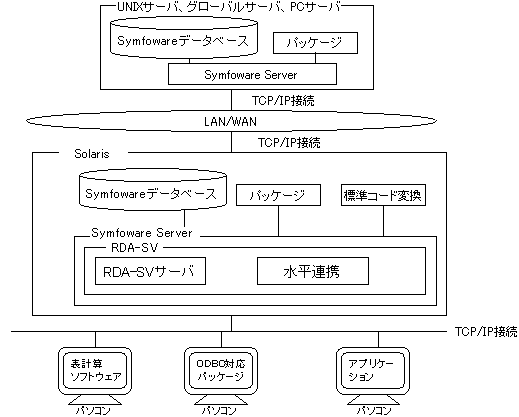 アプリケーションからほかのサーバシステムのデータベースをアクセスする場合、RDA-SVと連携するパッケージ(たとえば、ORACLE7トランスペアレントGW、CAPEなど)が必要です。