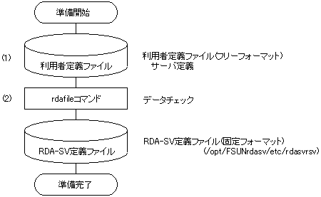 サーバ定義は、利用者定義ファイルに必要な項目をフリーフォーマットで記述し、これをrdafileコマンドにより固定フォーマットのRDA-SV定義ファイルに変換することで有効となります。