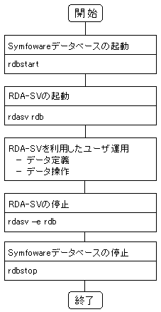 以下の図に、Symfowareデータベースの起動・停止を含めた全体の運用操作例を示します。