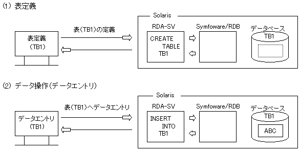 クライアントシステムからサーバシステム上のSymfowareデータベースに対して、データ定義文を実行する場合RDA-SVを経由して作成した表のアクセス環境を、Symfowareデータベースの起動・停止に合わせて開設または終了させる必要があります。