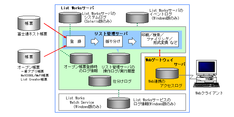 List Worksサーバのシステムログ(Solaris版のみ) | Solaris版を利用している環境において、帳票の登録、およびList Worksクライアントからリスト管理サーバへの接続を行った場合に、実行結果が記録されます。 | |