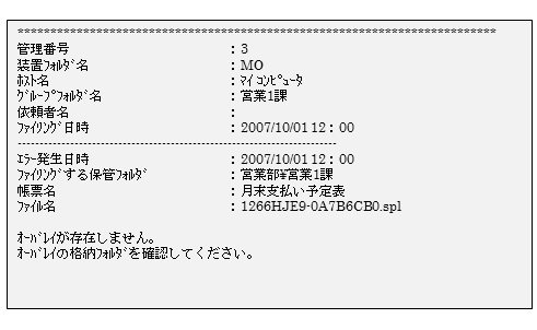 なお、「エラー発生日時」、「ファイリングする保管フォルダ」、「帳票名」、および「ファイル名」の項目は、正常にファイリングされた場合には、出力されません。
