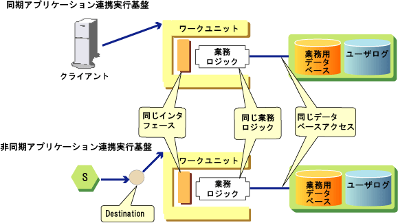 本製品では、サーバで動作する業務アプリケーションは、同期、非同期といった業務形態に依存せず共通に開発することができます。結果、業務形態が変更になった場合もアプリケーションを変更することなく、アプリケーションの再利用が可能であり、システム変更を柔軟に短期間で行うことができます。