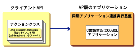 J2EE Connector Architectureで規定されたインタフェースであるCCIを使用してサーバアプリケーションを呼び出すための機能を、同期アプリケーション連携実行基盤のResource Adapterとして提供します。これにより、J2EEの標準的なインタフェースによる呼び出しが可能となります。