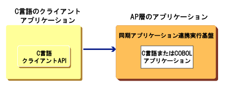 C言語のクライアントアプリケーションは、サーバアプリケーション上からC言語用のクライアントAPIを発行することで、サーバアプリケーションを呼び出します。アプリケーションの構造には以下の2種類があります。C言語用のクライアントAPIは、サーバアプリケーションが、COBOLやC言語だけの場合に使用します。