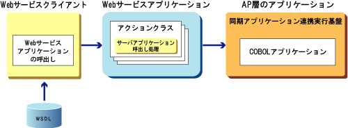 Webサービスクライアントアプリケーションは、Webサービスアプリケーションのインタフェースが定義されたWSDLをインポートしてWebサービスアプリケーションの呼出しを実装します。Webサービスアプリケーションは同期アプリケーション連携実行基盤のクライアントAPIを実行してサーバアプリケーションにリクエストを発行します。