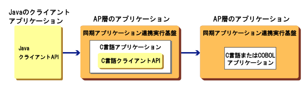 クライアントアプリケーション | 同期アプリケーション連携実行基盤のクライアントAPIを実行してサーバアプリケーションにリクエストを発行するアプリケーションです。 | Java |