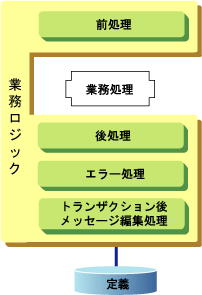 同期アプリケーション連携実行基盤は、クライアントアプリケーションから要求を受け付けると対応するサーバアプリケーション(業務ロジック)を定義ファイルに従い実行します。アプリケーションは、前処理、後処理、エラー処理およびトランザクション後メッセージ編集処理の各処理と業務処理から構成されます。