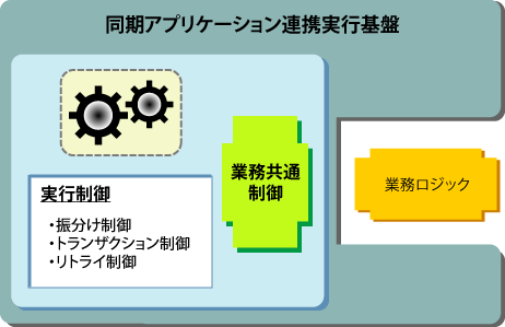 同期アプリケーション連携実行基盤の提供する振分け制御、トランザクション制御、リトライ制御などの実行制御をカスタマイズするための制御ロジックです。これにより、制御ロジックと業務ロジックを分離して、業務ロジックの独立性が高めることが可能です。
