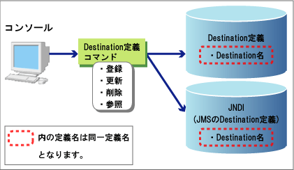 • Destination定義コマンドで登録したJMS Destination定義は、Destination定義コマンドで操作してください。